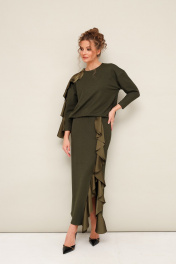 Элегантный трикотажный комплект, состоящий из джемпера и юбки. Джемпер прямого силуэта со спущенной линией втачивания плеча, рукава в длине 7/8. По спинке разрез с застежкой на пуговицу и навесную петлю. Юбка в длине миди с притачным поясом на резинке. Спереди обработан высокий разрез. Комплект декорирован двойным сатиновым воланом по плечевому шву, рукаву и по вертикальному подрезу в юбке.