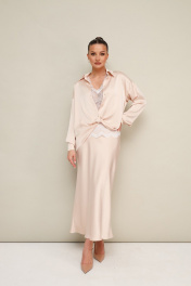 Элегантная блузка прямого кроя, выполнена из струящейся ткани с благородным матовым блеском. Горловина с рубашечным воротником на отрезной стойке, центральная застежка на петли и пуговицы. Перед блузки выполнен с декоративным перекрутом в низжней части застежки. Рукава со спущенной линией втачивания плеча, манжеты с застежкой на петли и пуговицы. Спинка с отрезной кокеткой и бантовой складкой. Топ прямого силуэта, выполнен из изысканного французского кружева. V-образный вырез горловины обработан кружевной отделкой.
