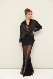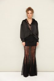 Силуэтная юбка годе с расклешением от линии колен с втачными клиньями. Юбка выполнена из изысканного французского кружева. Пояс обработан резинкой для комфорта и регуляции размера. В комплекте прилагается нижняя юбка в длине мини с резинкой по поясу.