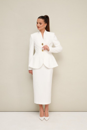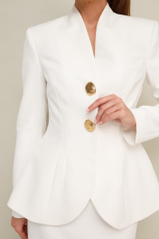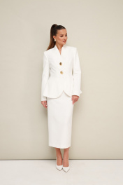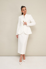 Стильный 2-х предметный комплект, состоящий из жакета и юбки, выполненный из костюмной ткани. Жакет прилегающего силуэта, слегка расширенный к низу. Горловина с цельнокроеной стойкой и V-образным вырезом. Центральная застёжка на потайные пришивные кнопки с декоративными акцентными пуговицами. Рукава втачные, двухшовные. Спинка с рельефами и средним швом. Юбка в длине миди, пояс на обтачке, застежка в среднем шве по спинке на потайную молнию. Для удобства движения сзади обработана шлица. Жакет и юбка на подкладке. ВНИМАНИЕ! ФУРНИТУРА (АКЦЕНТНЫЕ ПУГОВИЦЫ) ОТЛИЧАЕТСЯ ОТ ПРЕДСТАВЛЕННОЙ НА ФОТО! (не такие как на фото)