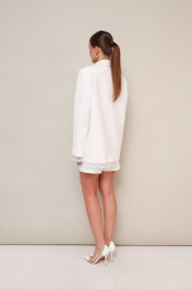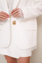 Жакет актуального прямого кроя, выполнен из костюмной ткани. Воротник пиджачного типа с отложными лацканами, край борта скругленный по низу жакета. Спереди обработаны прорезные карманы в рамку с клапанами. Рукава втачные двухшовные. Спинка со средним швом. Низ жакета и рукавов декорирован французским кружевом. Жакет обработан подкладкой.