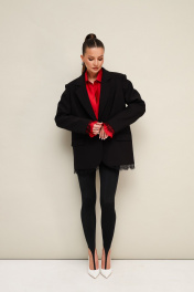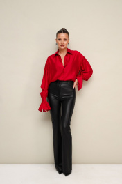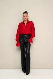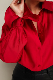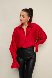 Акцентная блузка прямого кроя, выполнена из натуральной невесомой ткани с матовым блеском. Горловина с рубашечным воротником на отрезной стойке, центральная застежка на петли и пуговицы. Рукава со спущенной линией втачивания плеча, манжеты с рюшей с застежкой на навесные петли и пуговицы.