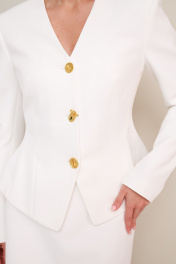 Комплект, состоящий из жакета, юбки и шарфа, выполнен из костюмной ткани. Силуэтный жакет актуального кроя с V-образным вырезом горловины. Центральная застёжка на петли и пуговицы. Рукава втачные, двухшовные. Юбка в длине мини, на обтачке по поясу, с застежкой на потайную молнию в среднем шве спинки. Низ юбки декорирован французским кружевом. Жакет и юбка обработаны подкладкой.