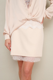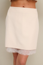 Стильная юбка прямого силуэта в длине мини. Верхняя юбка выполнена из костюмно-плательной ткани, пояс на обтачке, застёжка на потайную молнию в среднем шве по спинке. Нижняя юбка на резинке по поясу, низ обработан кружевной отделкой с сеткой.