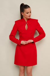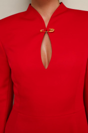 Платье в длине мини, отрезное по линии талии, выполнено из плательной ткани. Горловина с цельнокроеной стойкой и вырезом «капля» с декоративной брошью в виде английской булавки. Лиф переда с рельефами. Длинные друхшовные рукава. Юбка А-образного силуэта. В среднем шве спинки застежка на потайную молнию.