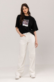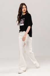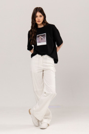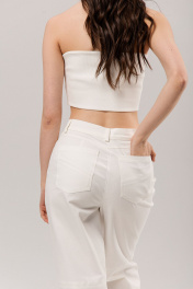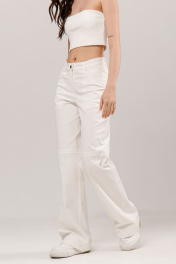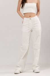 Брюки с высокой посадкой расширенные от бедра: •по переду и сзади декоративные подрезы с отстрочкой • по спинке накладные карманы • низ брюк с широкой подгибкой
