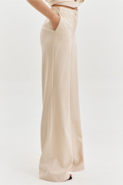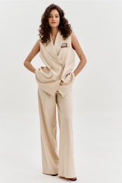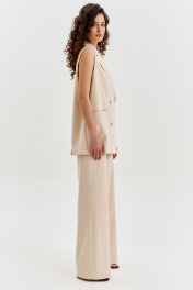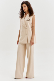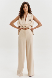 Комплект женский, состоящий из жилетки и брюк. Жилетка прямого силуэта, длиной ниже линии бедер. Спинка с плечевой вытачкой с левой стороны, с ассиметричной складкой. По переду с правой стороны обработан карман с листочкой. В области груди на левом переде настрочен клапан с декоративной пряжкой. Воротник пиджачного типа с лацканами. Двубортная застежка по переду на петли и пуговицы. Жилетка на подкладке. Брюки прямого силуэта, на притачном поясе с резинкой по спинке. По задним половинкам талиевые вытачки. По передним половинкам обработаны боковые карманы с наклонным входом, и застежка на тесьму-«молнию» с гульфиком и откоском. По поясу застежка на петлю и пуговицу.