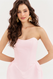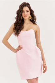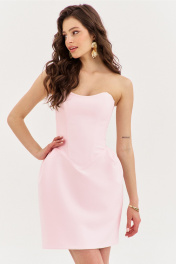 Платье прилегающего силуэта, длиной до середины бедра. Платье отрезное по линии талии. Лиф платья выполнен в виде корсета со шнуровкой по спинке. Юбка без бокового шва с мягкими складками от шва притачивания к корсету. За счет складок юбка имеет форму «тюльпана». Застежка на потайную тесьму-«молнию» в среднем шве спинки. Платье двойное, выполнено из основной ткани