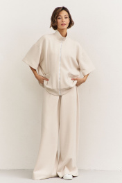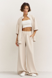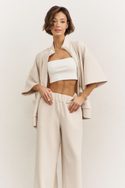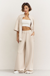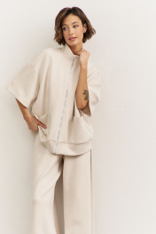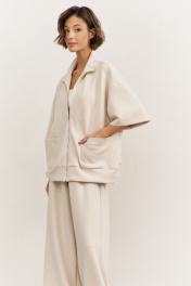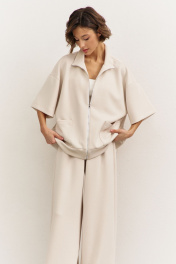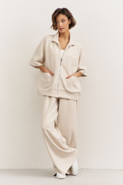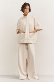 Комплект (толстовка+брюки). Толстовка свободного кроя: • спущенная линия плеча • воротник-стойка • застежка на молнию • накладные карманы • рукава втачные 3/4 • по низу притачная планка Брюки свободного кроя: • притачной пояс на резинке • в боковых швах карманы