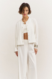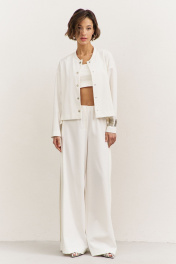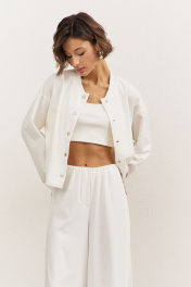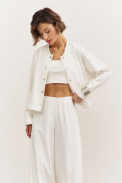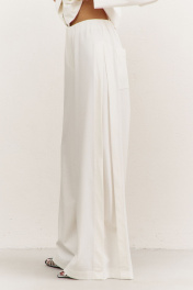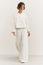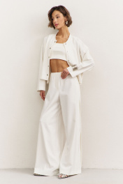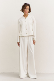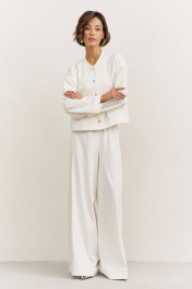 Комплект (джемпер+брюки). Джемпер свободного кроя: • спущенная линия плеча • по горловине стойка • застежка на кнопки • рукава втачные, длинные Брюки свободного кроя: • цельнокроеный пояс с резинкой • имитация гульфика • по спинке накладные карманы • в боковых швах декоративный клин, расширенный к низу