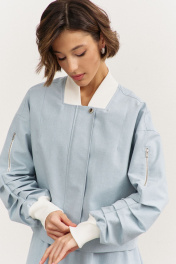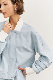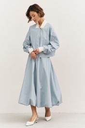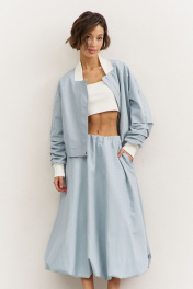Комплект (куртка +юбка). Куртка свободного кроя: • спущенная линия плеча • воротник-стойка • рукава втачные, длинные с декоративными складками • по рукавам прорезные карманы с молниями • манжеты и горловина из довяза • в боковых швах карманы • застежка на молнию, которая прикрыта пластроном с кнопками • на подкладке Юбка-баллон: • цельнокроеный пояс с резинкой • в боковых швах карманы • на подкладке • длина миди