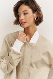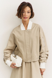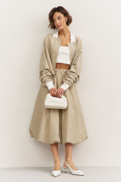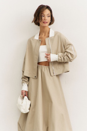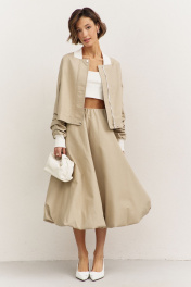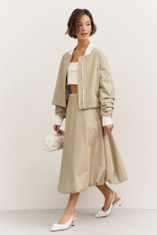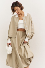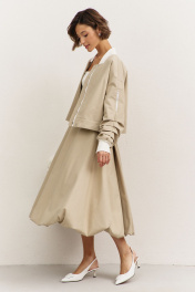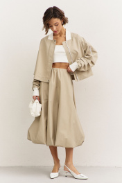 Комплект (куртка +юбка). Куртка свободного кроя: • спущенная линия плеча • воротник-стойка • рукава втачные, длинные с декоративными складками • по рукавам прорезные карманы с молниями • манжеты и горловина из довяза • в боковых швах карманы • застежка на молнию, которая прикрыта пластроном с кнопками • на подкладке Юбка-баллон: • цельнокроеный пояс с резинкой • в боковых швах карманы • на подкладке • длина миди
