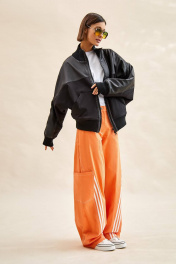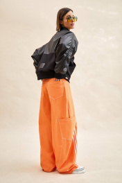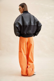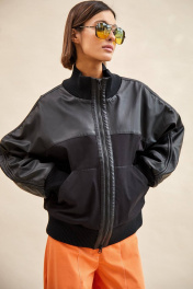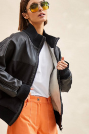 Куртка-бомбер: - О-силуэт; - на подкладке из флиса; - цельнокроеные рукава; - сзади с спереди кокетка из экокожи; - застежка спереди на молнию; - вставка по плечу со шнурами; - спереди накладные утепленные карманы; - воротник стойка из трикотажа; - по низу куртки и рукавов трикотажные манжеты в рубчик; - на спинке аппликация с логотипом.