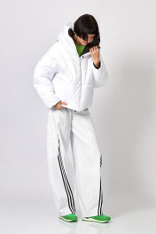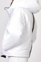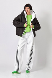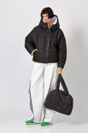 Куртка двухсторонняя: - свободный силуэт - сезон: зима - стёганая, утеплитель изософт 300 - спущенная линия плеча - рукава двухшовные, расширенные к середине, зауженные к низу - прорезные карманы с листочкой с обеих сторон - глубокий притачной капюшон по линии горловины - застёжка на двухстороннюю молнию и планку с кнопками - на одной стороне спинки с двумя вертикальными лампасами