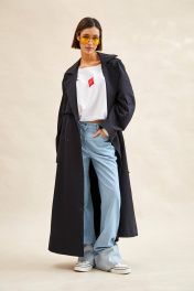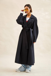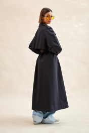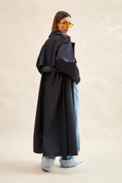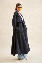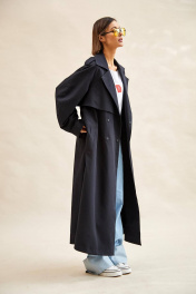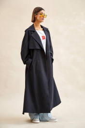 Тренчкот: - расширенный силуэт; - двубортная застёжка на кнопки; - наклонные карманы с листочкой; - воротник пиджачного типа; - отлетная кокетка по спинке и переду; - рукав-реглан, двухшовный, со складками по локтевому шву, с прямыми манжетами с застёжкой на кнопку; - двойная пата по плечу; - широкая шлевка с кожаной этикеткой и тиснением; - съёмный пояс из основной ткани; - на подкладке.