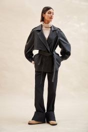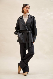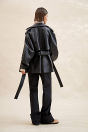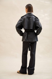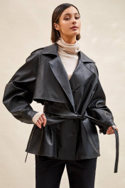 Тренч укороченный из экокожи: - расширенный силуэт; - двубортная застёжка на кнопки; - наклонные карманы с листочкой; - воротник пиджачного типа; - отлетная кокетка по спинке и переду; - рукав-реглан, двухшовный, со складками по локтевому шву, с прямыми манжетами с застёжкой на кнопку; - двойная пата по плечу; - широкая шлевка с кожаной этикеткой и тиснением; - съёмный пояс из основной ткани; - на подкладке.