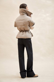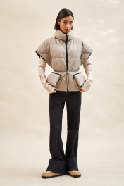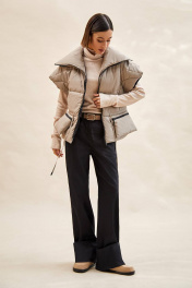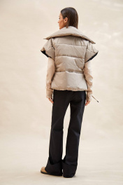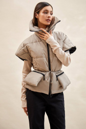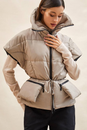 Жилет стеганый: - силуэт полуприлегающий; - стеганый, утеплитель изософт 150; - спущенная линия плеча; - с застежкой на молнию; - высокий воротник-стойка; - варианты ношения: в расстегнутом виде разложен по плечам, либо в застегнутом виде с отворотом; - отрезной по линии талии; - спереди рельефы из проймы; - по талии наружная кулиска с тонкой завязкой для большего приталивания; - по линии талии спереди расположены отлетные утепленные карманы на молнии - утеплитель – изософт 100.