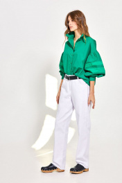 Блуза - силуэт прямой - линия плеча спущена - застёжка на цельнокроеную планку с пуговицами - на спинке кокетка и встречная складка - рукава длинные, широкие, со сборкой сверху, с горизонтальными вставками другого цвета, со сборкой и манжетами по низу - воротник рубашечный с отрезной стойкой.