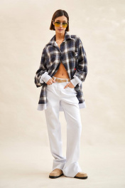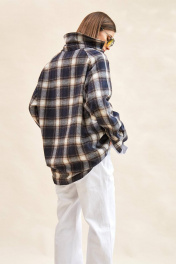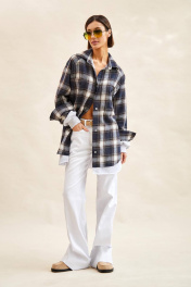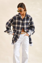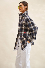Рубашка в клетку: - силуэт прямой; - удлиненная; - двухслойная: нижний слой из футера трехнитки, верхний слой короче нижнего; - воротник рубашечный; - застежка на планку с пуговицами; - спереди накладные карманы; - покрой рукава реглан; - верхний рукав с планкой застежки и манжетой, на пуговице; - нижний рукав с манжетами из трикотажа в рубчик (кашкорсе); - по низу слоя из футера открытый срез.