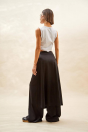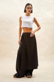 Брюки с накидкой: - прямой силуэт; - застежка сбоку на потайную молнию; - боковые карманы. Накидка съёмная: - расширенный силуэт; - пояс с застёжкой сбоку на полукольца; - в боковом шве карман.