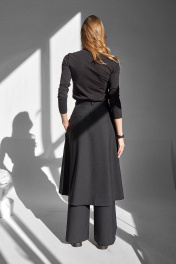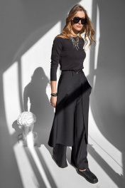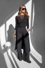 Брюки: - силуэт - трапеция - расклешённые от бедра - спереди и сзади кокетка - от кокетки расклешённая отлетная деталь - спереди накладные карманы со складками - застёжка спереди на молнию и пуговицу - притачной пояс со шлёвками