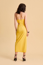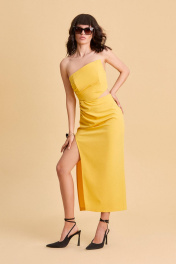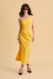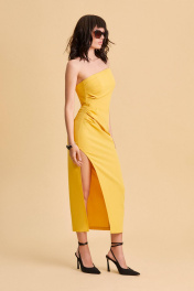 Платье: - прилегающий силуэт - отрезное по талии - асимметричный вырез на боку слева - верх на корсетных косточках с асимметричной линией верха и драпировкой справа - низ с высоким вырезом и драпировкой - застёжка на потайную молнию в среднем шве
