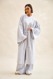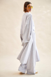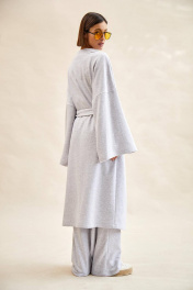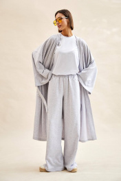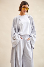 Кардиган: - ткань - футер трехнитка; - свободный силуэт; - спущенная линия плеча; - рукава широкие прямые; - в боковых швах карманы и шлевки для сьемного пояса; - борта и горловина обработаны притачными планками. Брюки: - ткань - футер трехнитка; - свободные, прямого силуэта; - средняя посадка; - по бокам карманы; - пояс на резинке.