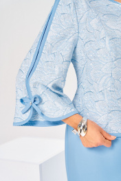 Платье женское, относится к торжественной одежде. Платье женское, полуприлегающего силуэта, длиной за колено. Платье отрезное по линии талии, выполнено имитацией костюма. Верхняя часть переда с 2-мя отрезными рельефами, выходящими из плечевых швов. Верхняя часть спинки с 2-мя отрезными бочками и средним швом. Застёжка на потайную тесьму-молнию в среднем шве спинки. Горловина фигурная. Припуски горловины среднего шва переда и низа верхней части обработаны косой бейкой шириной 1-1 см. Рукав 2-х шовный, втачной, длиной 7/8. припуски верхнего шва рукава и низа обработаны косой бейкой, шириной 1,1 см. Рукав декорирован пришивным бантом со стразой. Нижняя часть переда без конструктивных особенностей нижняя часть спинки с 2-мя таллиевыми вытачками и средним швом, заканчивающимся шлицей. Платье на подкладке отрезной по линии талии. Платье с плечевыми накладками. Длина спинки платья 99 см, длина рукава 49 см.