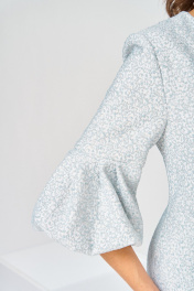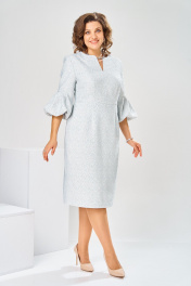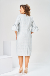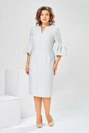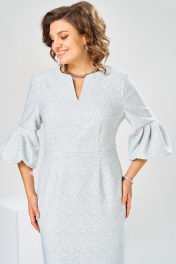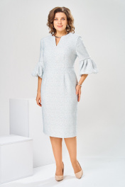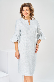 Платье женское, относится к торжественной нарядной одежде. Платье женское, полу прилегающего силуэта, длиной ниже колена. Перед отрезной по линии талии. Верхняя часть переда со средним швом и 2-мя таллиевыми вытачками, нижняя часть с 2-мя таллиевыми вытачками. Спинка с 2-мя таллиевыми вытачками и средним швом, заканчивающимся шлицей. Горловина фигурная, обточная, без воротника. Застёжка на потайную тесьму-молнию в среднем шве спинки. Рукав втачной, одно шовный, длиной 3/4, с горизонтальным разрезом, нижняя часть рукава с 5-ю односторонними складками, со сборкой по низу, низ обточной. Платье на подкладке с плечевыми накладками. Длина спинки платье 111 см, длина рукава 45 см.