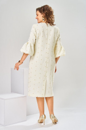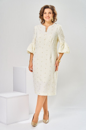 Платье женское, относится к торжественной нарядной одежде. Платье женское, полу прилегающего силуэта, длиной ниже колена. Перед отрезной по линии талии. Верхняя часть переда со средним швом и 2-мя таллиевыми вытачками, нижняя часть с 2-мя таллиевыми вытачками. Спинка с 2-мя таллиевыми вытачками и средним швом, заканчивающимся шлицей. Горловина фигурная, обточная, без воротника. Застёжка на потайную тесьму-молнию в среднем шве спинки. Рукав втачной, одно шовный, длиной 3/4, с горизонтальным разрезом, нижняя часть рукава с 5-ю односторонними складками, со сборкой по низу, низ обточной. Платье на подкладке с плечевыми накладками. Длина спинки платье 111 см, длина рукава 45 см.