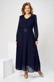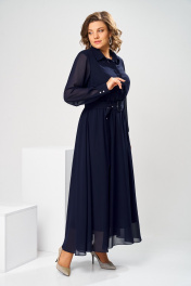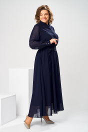 Платье женское может быть использовано как для повседневной носке, так и нарядная одежда. Платье женское, отрезное по линии талии, расширенное к низу, длинное. Верхняя часть переда с 2-мя нагрудными вытачками, с 2-мя вертикальными цельнокроенными планками, на правой части сформированная супатная застёжка на 5-ть вертикально обмётанных петель и 5-ть пришивных пуговиц; нижняя часть цельнокроенная. Верхняя часть спинки и нижняя без конструктивных особенностей. По шву соединения верхней и нижней частей платья (по линии талии) платье собрано на эластичную тесьму. Горловина круглая с втачным воротником, рубашечного типа с отрезной стойкой. Рукав втачной, длинный, одно шовный; низ рукава с 2-мя односторонними складками, с притачной манжетой, с застёжкой на 2-е обмётанные петли и 2-е пришивные пуговицы. Платье на подкладке. Платье с плечевыми накладками. К платью прилагается съёмный пояс с застёжкой на пряжку и 6-ть пробивных металлических блочек. Длина спинки пдатья 137 см, Длина рукава 63 см.