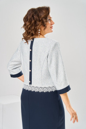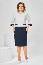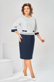 Платье женское относится к нарядной торжественной одежде. Платье женское, отрезное ниже линии талии на 4 см, полуприлегающего силуэта, длиной ниже колена. Верхняя часть переда из отделочной ткани с 2-мя отрезными бочками и 2-мя настрочными ленточками на уровне линии талии, декорированными 2-мя пришивными пуговицами; нижняя часть переда с 2-мя таллиевыми вытачками. Верхняя часть спинки из отделочной ткани с 2-мя отрезными бочками и притачной вертикальной планкой, декорированной 5-тью пришивными пуговицами; нижняя часть спинки с 2-мя таллиевыми вытачками и средним швом, заканчивающимся шлицей. Шов соединения верхней и нижней частей платья декорирован настрочной отделочной тесьмой (кружевом). Горловина круглая, обточная, без воротника. Застёжка на потайную тесьму-молнию в левом боковом шве платья.Рукав втачной, 2-х шовный из отделочной ткани, длиной 3/4 с притачной манжетой. Верхняя часть платья на подкладке. Платье с плечевыми накладками. Длина спинки платья 105 см, длина рукава 44 см.