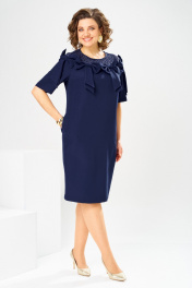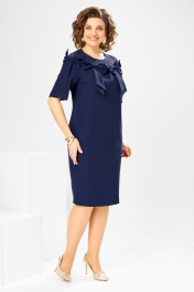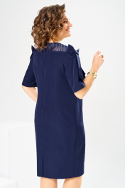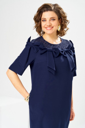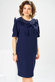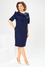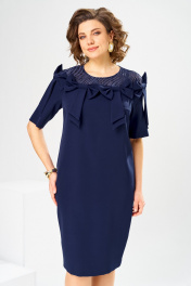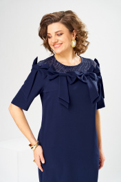 Платье женское относится к нарядной торжественной одежде. Платье женское, полуприлегающего силуэта, длиной за колено. Перед с 2-мя нагрудными вытачками, с отрезной кокеткой и отделочной ткани, переходящей из рукавов. Спинка с отрезной кокеткой из отделочной ткани, переходящей на рукав, с 2-мя таллиевыми вытачками, со средним швом, заканчивающимся шлицей. Горловина круглая, обточная без воротника. Застёжка на потайную тесьму-молнию в среднем шве спинки. Рукав втачной, одно шовный, длиной до локтя. Перед плятья по шву притачивания кокетки декорирован 4-мя настрочными бантами. Боковые швы с карманами. Платье без плечевых накладок. Длина платья по спинке 102 см, длина рукава 27 см.