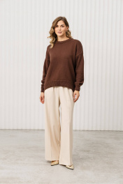 Этот стильный и комфортный джемпер станет отличным дополнением вашего гардероба! Он идеально подходит для создания уютных и модных луков в прохладное время года, сочетая в себе комфорт, элегантность и универсальность. Свитер отлично впишется в повседневный стиль, офисные будни или прогулки по городу. Основные особенности джемпера: Цвет: бежевый лайт (светло-желтый, шоколадный), который легко сочетается с различными оттенками и добавляет образу теплоту и лёгкость; Дизайн: свитер с круглым вырезом горловины и объёмными рукавами, что придаёт изделию оригинальность и уют. Ребристые манжеты и низ подчёркивают стиль и аккуратность; Материал: мягкая и приятная на ощупь трикотажная ткань, которая обеспечивает комфорт в течение всего дня; Крой: свободный, слегка удлинённый, что делает свитер универсальным для различных стилей и случаев. С чем носить: Джемпер отлично сочетается с брюками классического кроя, как на фото, джинсами или юбками. Для завершения образа подойдут туфли на каблуке, лодочки или стильные ботинки. Дополните образ минималистичными аксессуарами, такими как тонкий браслет или серьги. Уход за изделием: Рекомендуется стирка в деликатном режиме при температуре до 30°C. Не использовать отбеливатели. Сушить в расправленном виде, избегая прямых солнечных лучей.