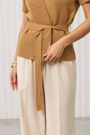 Этот стильный и женственный жакет станет отличным дополнением вашего гардероба! Он идеально подходит для создания утончённых и модных луков, сочетая в себе комфорт, элегантность и оригинальный дизайн. Топ отлично впишется в офисный стиль, деловые встречи или вечерние мероприятия. Цвет: белый, который добавляет образу свежесть и лёгкость; Дизайн: топ с V-образным вырезом и короткими рукавами. Ребристая текстура и завязка на поясе придают изделию оригинальность и женственность, подчёркивая фигуру; Материал: мягкая и приятная на ощупь трикотажная ткань, которая обеспечивает комфорт в течение всего дня; Крой: слегка приталенный, что делает топ универсальным для различных стилей и случаев. С чем носить: Топ отлично сочетается с брюками свободного кроя, как на фото, юбками или джинсами. Для завершения образа подойдут туфли на каблуке, лодочки или стильные сандалии. Дополните образ минималистичными аксессуарами, такими как тонкий браслет или серьги. Уход за изделием: Рекомендуется стирка в деликатном режиме при температуре до 30°C. Не использовать отбеливатели. Сушить в расправленном виде, избегая прямых солнечных лучей.