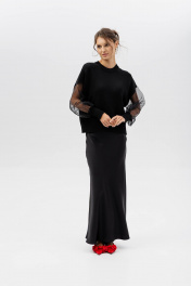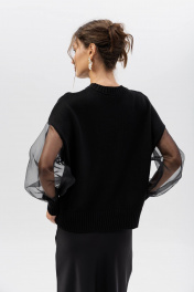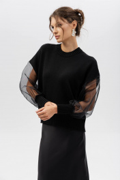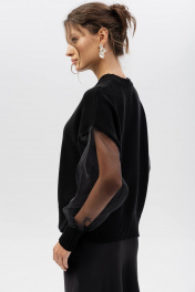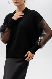 Этот стильный и женственный джемпер станет настоящей изюминкой вашего гардероба, идеально подходя для создания как повседневных, так и вечерних луков. Он сочетает в себе уют и элегантность, добавляя образу лёгкость и оригинальность. Основные особенности: Цвет: глубокий тёмно-синий, графитовый, который подчёркивает изысканность и легко сочетается с другими элементами одежды; Дизайн: классический крой с высоким воротником и прозрачными вставками из лёгкой ткани на рукавах, что придаёт образу романтичность и женственность; Материал: мягкий и плотный трикотаж, который отлично сохраняет тепло и форму, в сочетании с лёгкой, полупрозрачной тканью на рукавах; Крой: свободный, но в то же время подчёркивающий силуэт, что делает джемпер универсальным для различных стилей и случаев. С чем носить: Джемпер отлично сочетается с джинсами, брюками классического кроя или юбками-карандаш. Для завершения образа добавьте туфли на каблуке или стильные ботинки, а также минималистичные украшения, такие как тонкое ожерелье или серьги. Уход за изделием: Рекомендуется стирка в деликатном режиме при температуре до 30°C. Не использовать отбеливатели. Сушить в расправленном виде, избегая прямых солнечных лучей.