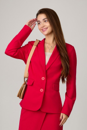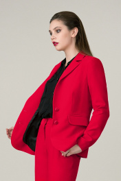 Жакет на подкладке приталенного силуэта с прорезными карманами с клапанами по переду. Воротник-английский. Рукава-двухшовные. Застегивается на две пуговицы.