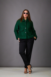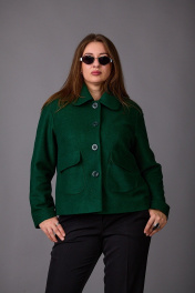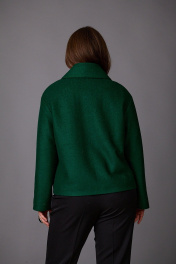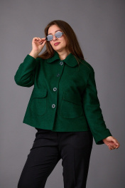 Жакет на подкладке из пальтовой ткани. Силуэт прямой, по переду нагрудные вытачки и накладные карманы с клапанами округлой формы. Пройма спущена, рукава узкие. Воротник с закругленными углами с притачной стойкой. Застегивается на 4 пуговицы.