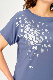 Джемпер из трикотажной хлопковой ткани, со спущенным плечом. Перед джемпера с принтом. Вырез горловины круглый, оформлен бейкой. Спинка без среднего шва. Печать: фольга-серебро Промеры на примере 56 размера: ОГ 124 (спущенное плечо), ОБ 125 см, длина по спинке 64,5 см. Длина рукава от основания шеи: разм. 46-52: 24-27 см , разм. 54-62: 27-31 см