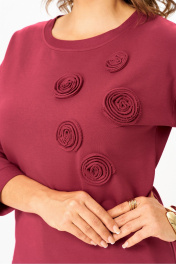 Джемпер женский из трикотажной хлопковой ткани (двунитка). По переду джемпера расположены декоративные элементы. Спущенное плечо, рукав 3/4. Низ рукава обработан манжетой. Вырез горловины круглый, оформлен бейкой. Промеры на примере 50 размера: ОГ 114 см (спущенное плечо), ОБ 114 см, длина по спинке 63 см. Длина рукава от основания шеи: 57 см