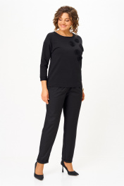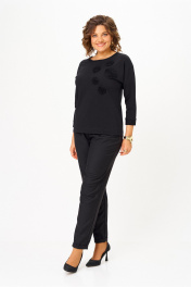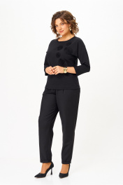 Джемпер женский из трикотажной хлопковой ткани (двунитка). По переду джемпера расположены декоративные элементы. Спущенное плечо, рукав 3/4. Низ рукава обработан манжетой. Вырез горловины круглый, оформлен бейкой. Промеры на примере 50 размера: ОГ 114 см (спущенное плечо), ОБ 114 см, длина по спинке 63 см. Длина рукава от основания шеи: 57 см