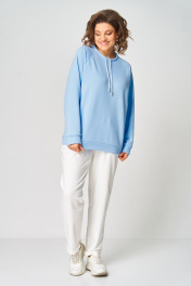 Джемпер женский из трикотажной хлопковой ткани (трехнитка). Рукав реглан. Низ рукава обработан притачной манжетой. Низ изделия оформлен притачным поясом. На спинке настрочен декоративный элемент. Вырез горловины круглый, обработан бейкой со шнуром. Промеры на примере 50 размера: ОГ 126 см, ОБ 112 см, длина по спинке 69 см. Длина рукава от крайней точки шеи: 75 см На модели надеты брюки: 2260