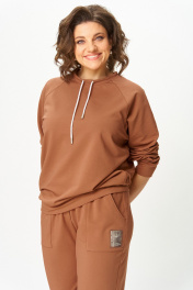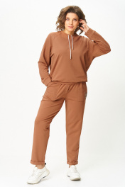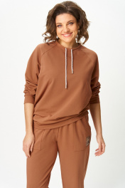 Джемпер женский из трикотажной хлопковой ткани (трехнитка). Рукав реглан. Низ рукава обработан притачной манжетой. Низ изделия оформлен притачным поясом. На спинке настрочен декоративный элемент. Вырез горловины круглый, обработан бейкой со шнуром. Промеры на примере 50 размера: ОГ 126 см, ОБ 112 см, длина по спинке 69 см. Длина рукава от крайней точки шеи: 75 см На модели надеты брюки: 2260