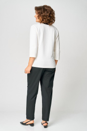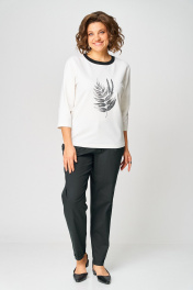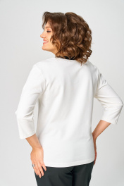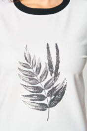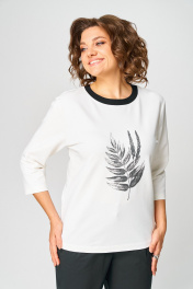 Джемпер женский из трикотажной хлопковой ткани (двунитка). По переду расположен принт. Рукав прямой втачной. Рукав 3/4. Вырез горловины круглый, обработан довязом. Промеры на примере 50 размера: ОГ 104 см, ОБ 104 см, длина по спинке 63 см. Длина рукава: 44 см Рост: 170 см