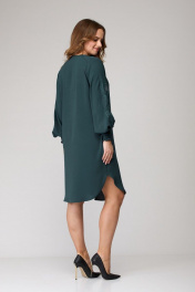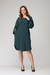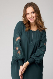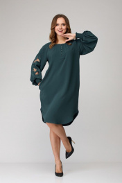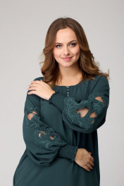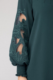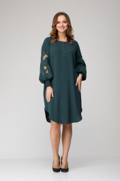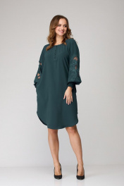 Платье женское из лёгкой струящейся ткани, прямого силуэта. Оригинальна в исполнении с художественной вышивкой по рукавам. По центру переда планка на 11 петель и столько же пуговиц. Рукав реглан, по низу рукава манжета присборена на эластичную тесьму (венгерку) для фиксации. Горловина округлой формы, по горловине изделия декоративные защипы. Низ фигурный, закруглен к бокам.
