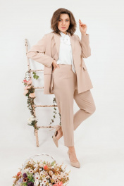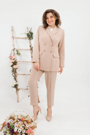 Жакет женский прямого силуэта из модной ткани. Перед с рельефами, с функциональными накладными карманами. С левой стороны переда карман-обманка. По центру переда двубортная застежка на две петли и две пуговицы и на одну потайную петлю и одну потайную пуговицу. Спинка с рельефами, со средним швом переходящим в шлицу. Рукав втачной, двухшовный, длинный. по низу рукава шлица на три петли три пуговицы. Воротник пиджачного типа. Изделие на подкладке.