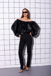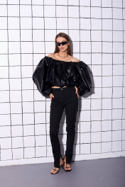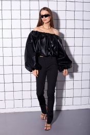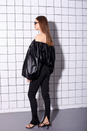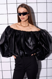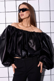 Топ женский, объемный, изготовлен из искусственной кожи. Топ драпирует, фиксирует складки и образует форму с помощью резинки и надежно держится на теле. Замеры: длина: 57см длина рукава: 60см