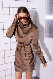 Эффектное короткое платье, в комплекте с красивым платком, который мы застилизовали на талии. Воротник стояче-отложной, рукав длинный с манжетой, линия плеча спущена, зафиксирована съёмными плечевыми накладками. Платье имеет потайную застёжку молнию и потайную планку на переде изделия. из изделия собран и зафиксирован в сборку с одной стороны. Замеры: длина: 93см