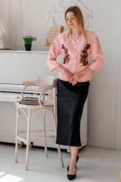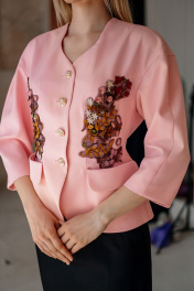 Жакет полуприлегающего силуэта. Спущенное плечо, рубашечный крой. Рукав 7/8, заужен книзу. Без воротника, с фигурным вырезом. Перед с застёжкой на пуговицы. На переде боковые карманы с клапаном. Боковые части жакета декорированы фрагментами вышивки на сетке. Жакет без подкладки. Длина жакета по центру спинки - 60,0 см. - для всех размеров. Длина рукава , вместе с плечевым швом - 61,0 см. от края горловины - для всех размеров. Ширина жакета на уровне груди - 44 размер - 47,0 см., 46 размер - 49,0 см., 48 размер - 51,0 см. ( половина). Ширина изделия по низу для 44 размер - 48 см., 46 размер - 50,0 см., 48 размер - 52,0 см. Ширина рукава внизу - 44 размер - 15,0 см., 46 размер - 16,0 см., 48 размер - 17,0 см. В плечевой шов вставлены плечевые накладки. Жакет выполнен из ткани производства Китая, п/э в составе , без лайкры ( не тянется). Предлагается для выходного и праздничного дня.