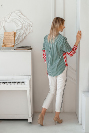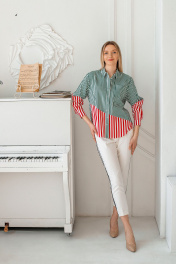 Блуза-рубашка прямого, свободного силуэта, двухцветная. Спущенное плечо, рубашечный крой. Рукав длинный, втачной, по низу рукава манжет (4,5 см для всех ов) с застёжкой на пуговицу. Воротник отложной со стойкой - рубашечного вида. Низ блузы оформлен фигурной линией. Застёжка на планки с пуговицами. Спинка блузы цельнокроенная , с кокеткой и со складкой из под неё. На левой половинке переда расположен накладной карман. Рубашка с конструктивно - асимметричными линиями по рукаву и переду. Длина изделия по центру спинки, от шва втачивания воротника - 72,0 см. - для всех ов. Длина рукава вместе с плечом, от шва втачивания воротника - 70,0см. - для всех ов. Ширина блузы на уровне груди - 44 р - 54,0 см. , 46 р - 56,0 см., (половина). Ширина изделия на уровне низа - 44 р - 54,0 см., 46 р - 56,0 см. Ширина рукава вверху - 44 р -18,5 см. (половина). 46 р -20,0 см. Использована ткань производства Италии, 95 % хлопка и 5 % эластана. Предлагается модель для каждого и выходного дня.